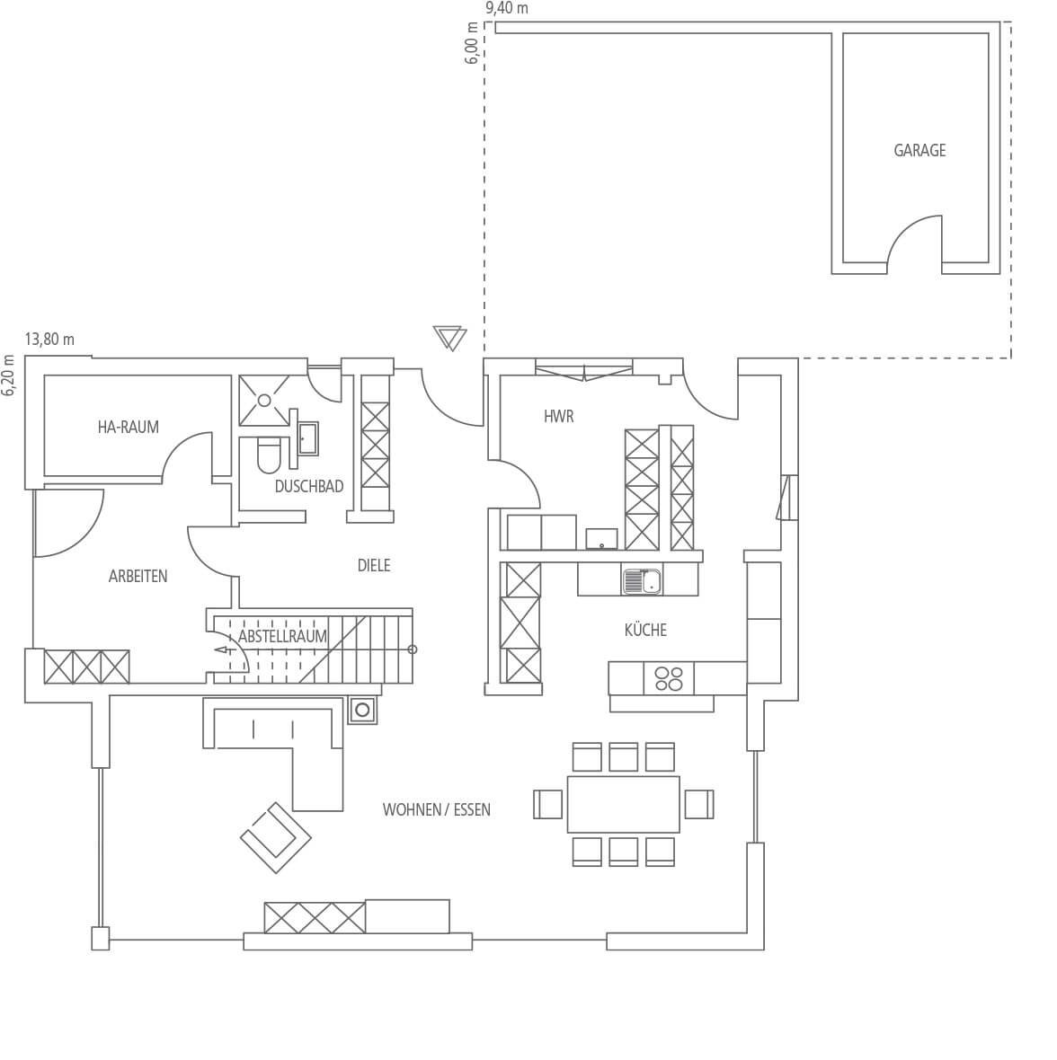 Durch einen Hausanschlussraum im Erdgeschoss kann auf einen Keller ganz verzichtet werden. Weitere funktionale Anforderungen sind durch das Arbeitszimmer, einen großen Hauswirtschaftsraum direkt neben der Küche sowie einen Abstellraum im Obergeschoss bestens erfüllt.