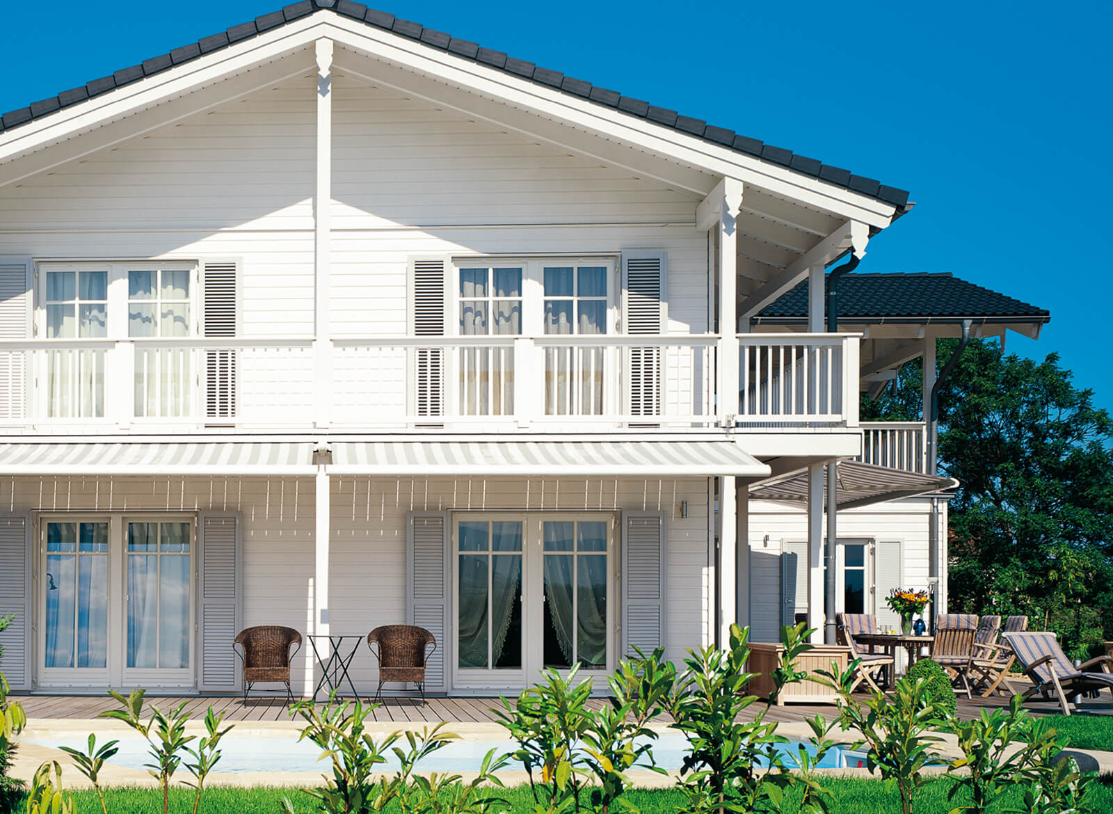 Beinahe herrschaftlich ist die Anmutung dieses Anwesens in elegantem Südstaaten-Stil mit sichtbarer Holzkonstruktion. Das besondere Flair entsteht durch das architektonische Feingefühl, das beim Baukörper selbst, aber auch bei der Gestaltung der Anbauten deutlich spürbar ist.