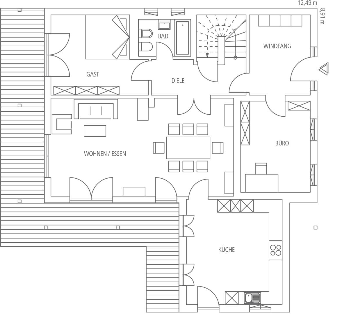 Den Wünschen der Baufamilie entsprechend verfügt dieses Haus im Erdgeschoss über eine funktionale Trennung der Räumlichkeiten. Von der Küche, dem Wohnzimmer und einem Gästezimmer gelangt man direkt auf die geräumige Terrasse.