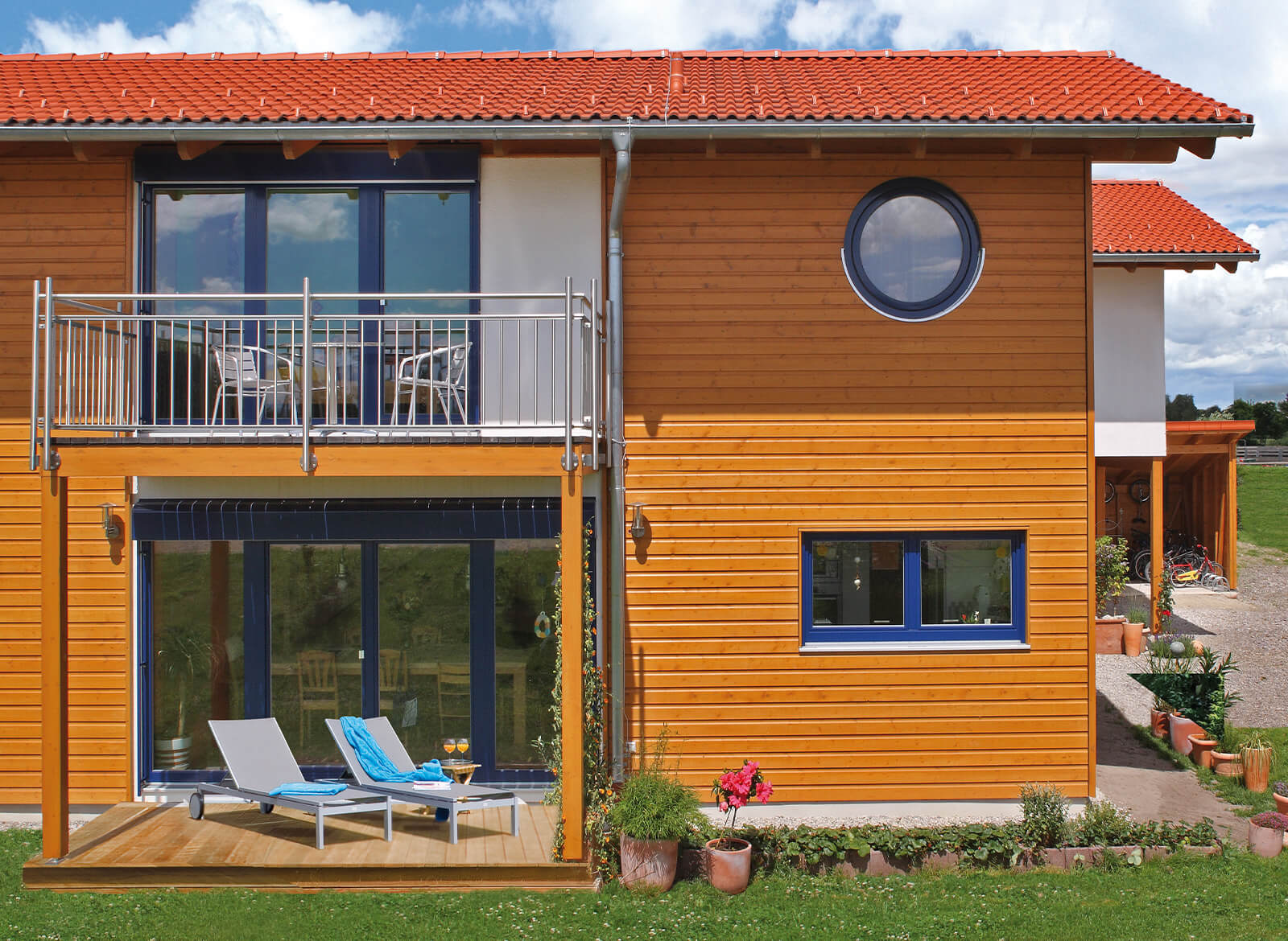 Originell ist die Gestaltung der Fassaden, die sich weiß verputzt, teilweise aber auch mit Holzverschalung präsentiert. Frische Akzente setzen die blauen Tür- und Fensterrahmen und natürlich die beiden Rundfenster.