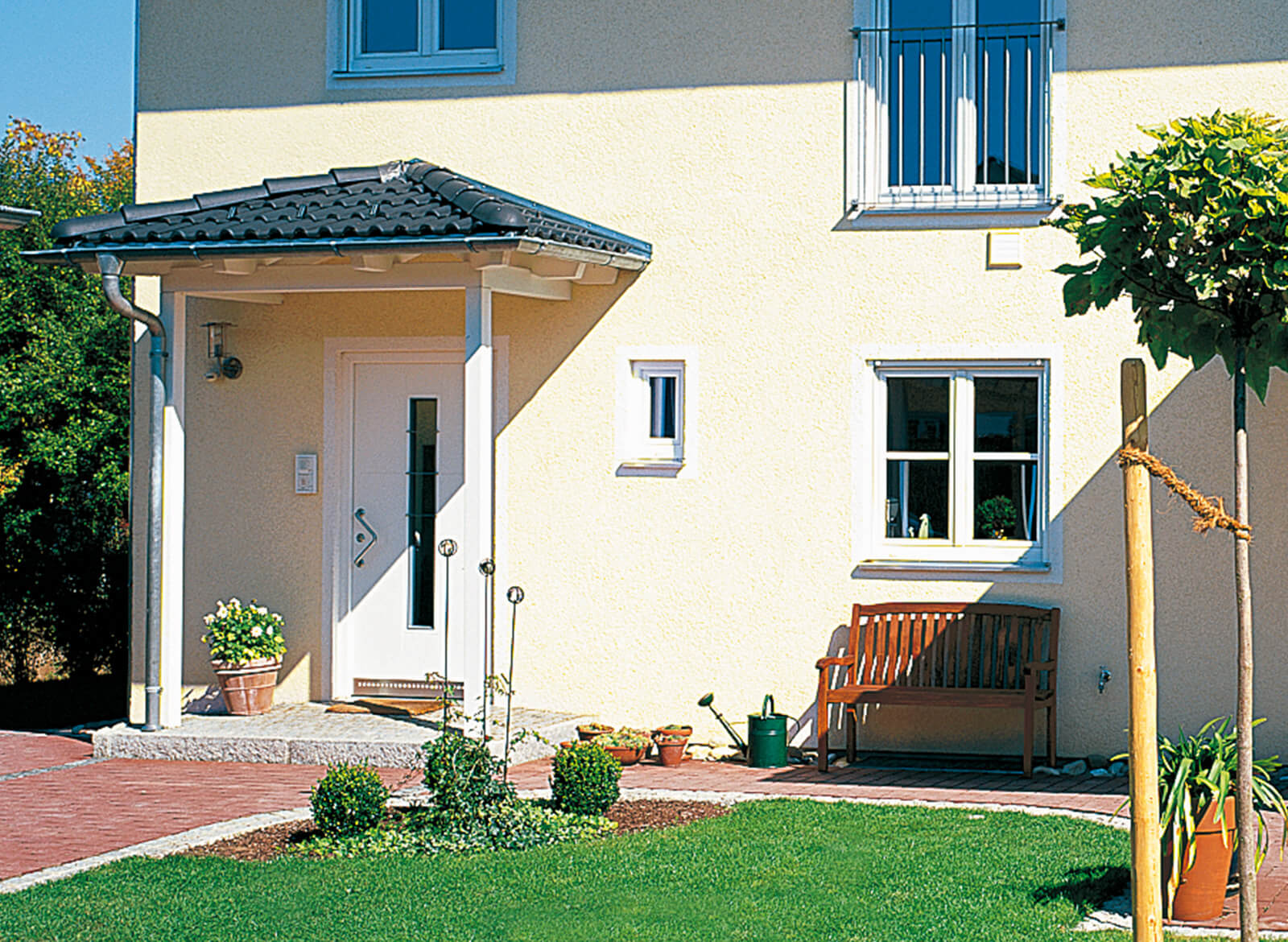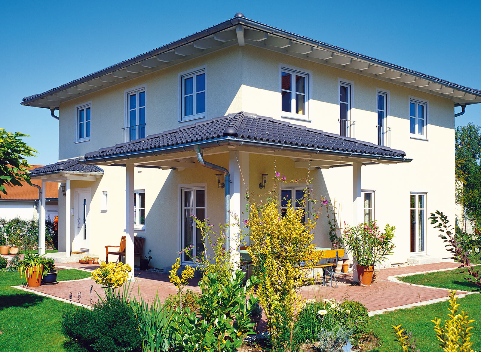 Vom Stil toskanischer Stadtvillen haben sich die Bauherren dieses Vitalhauses inspirieren lassen. Auf den ersten Blick sichtbar durch das Zeltdach und die exakte Fassadensymmetrie auf quadratischem Grundriss.