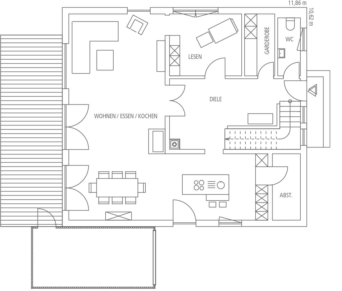 Modern gestaltet bietet dieses Regnauer Vitalhaus viel Platz. Großzügig verteilt sich der Wohn-, Ess- und Kochbereich im Erdgeschoss. Ohne Zwischenwände und fast komplett über drei Seiten. Der Luftraum in die obere Etage unterstreicht das offene Flair.