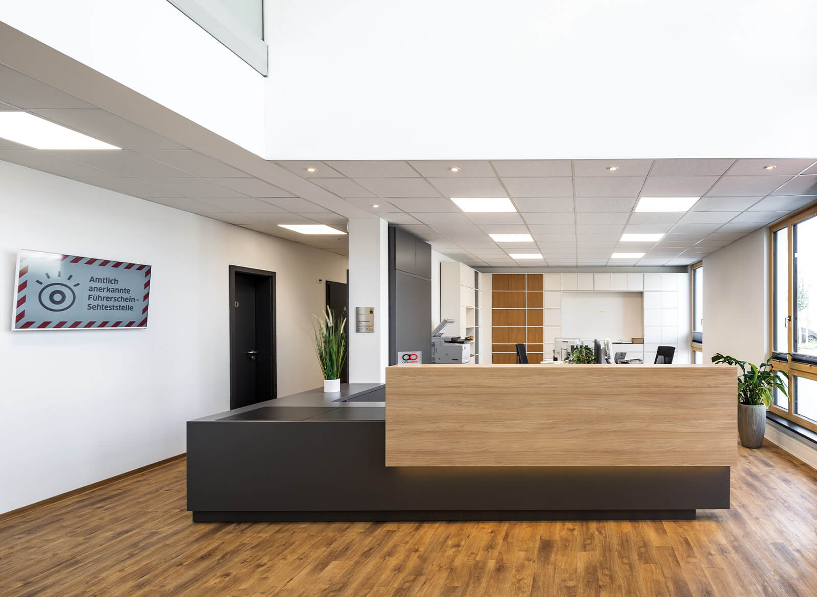 Das neue Vital-Businessgebäude von aktivoptik wartet mit einer durchdachten Raumstruktur auf: Nicht nur die Anordnung der Räumlichkeiten zueinander, auch die optimale Ausrichtung der Räume auf ihre verschiedenen Funktionalitäten überzeugt. Das Foyer beeindruckt durch seine Raumhöhe und fein abgestimmte Details in der Inneneinrichtung. Durch eine doppelflügelige Tür genau gegenüber vom Eingang gelangen Gäste in den lichtdurchfluteten Schulungsraum mit Zugang zur großen Terrasse für kreative Pausen.