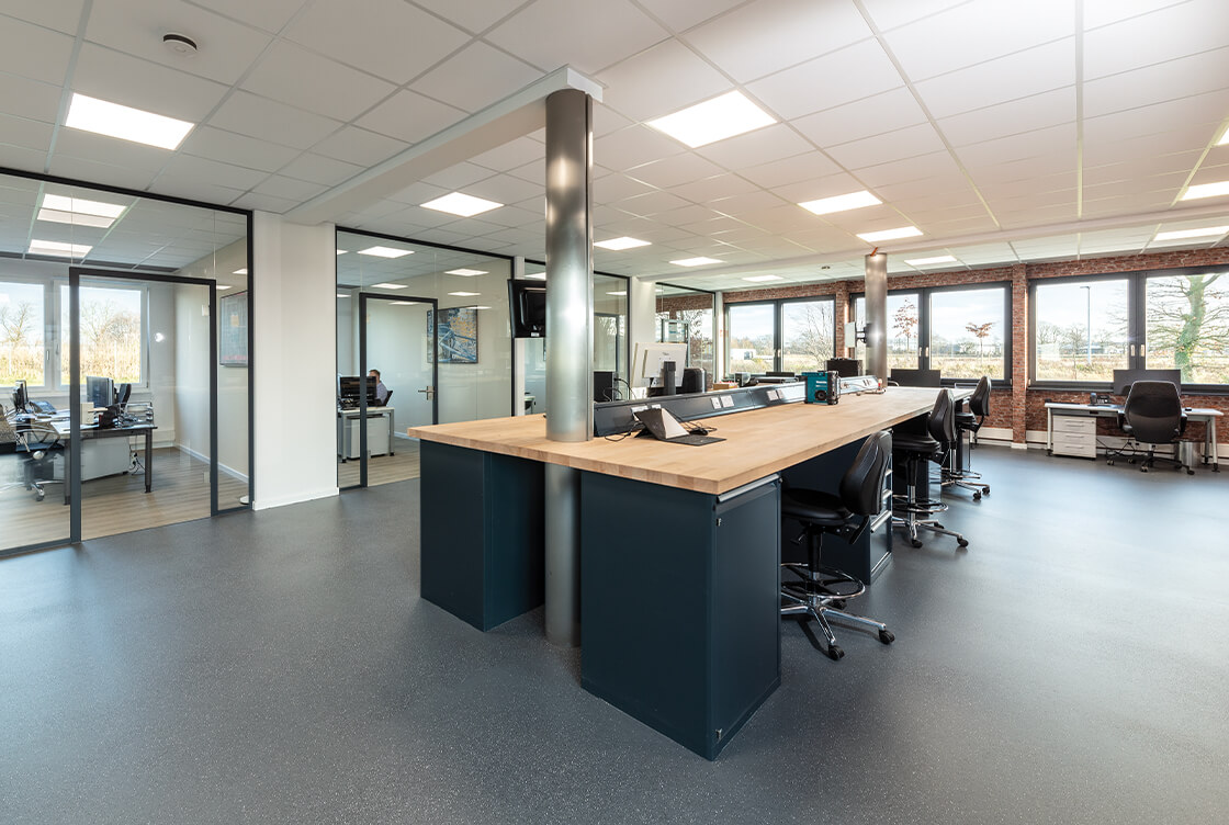 Kombi-Büro-Konzept fördert mit Glaswänden zu Verkehrs- und Kommunikationszonen Transparenz und Nachbarschaft, während verschließbare Türen konzentriertes Arbeiten ermöglichen.