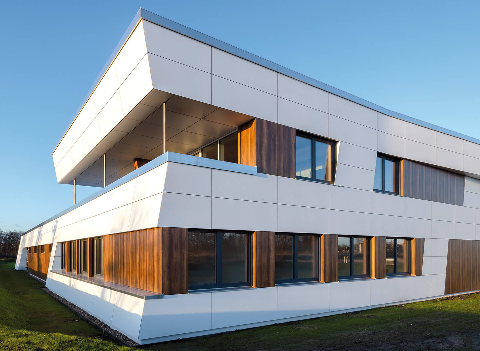 Die schräg auskragende Außenhaut des L-förmigen Flachdachbaus mit seiner in Weiß und Altholzoptik gehaltenen Fassade steht für Ideenreichtum und Mut. Ein vorausschauendes Energiekonzept mit autarker Energieversorgung per Luft-Wasser-Wärmepumpe fürs Heizen und Kühlen, einer 30 kW Photovoltaikanlage und einer E-Ladesäule zeigen Flexibilität, ökologisches Bewusstsein und Zukunftssicherheit. Das hochmoderne KNX-basierte Gebäudeautomationskonzept mit Fingerprint-basiertem Zugangssteuerungssystem macht deutlich, wie smarte Architektur im Alltag funktioniert. Geplant und schlüsselfertig erstellt durch Regnauer als Beitrag zum weiteren Unternehmenserfolg.