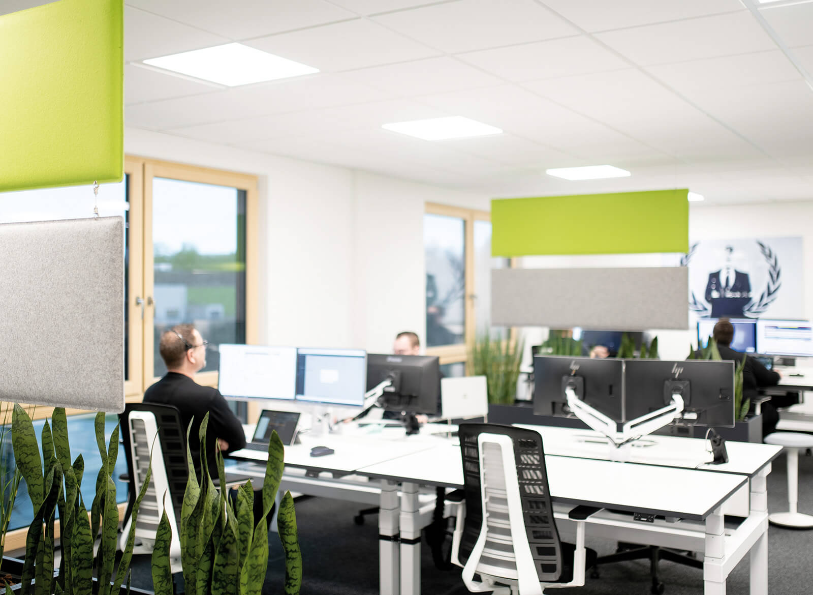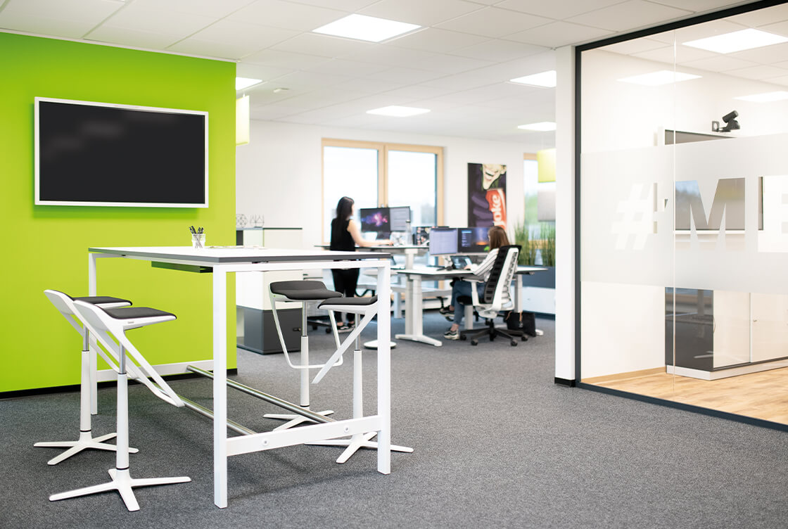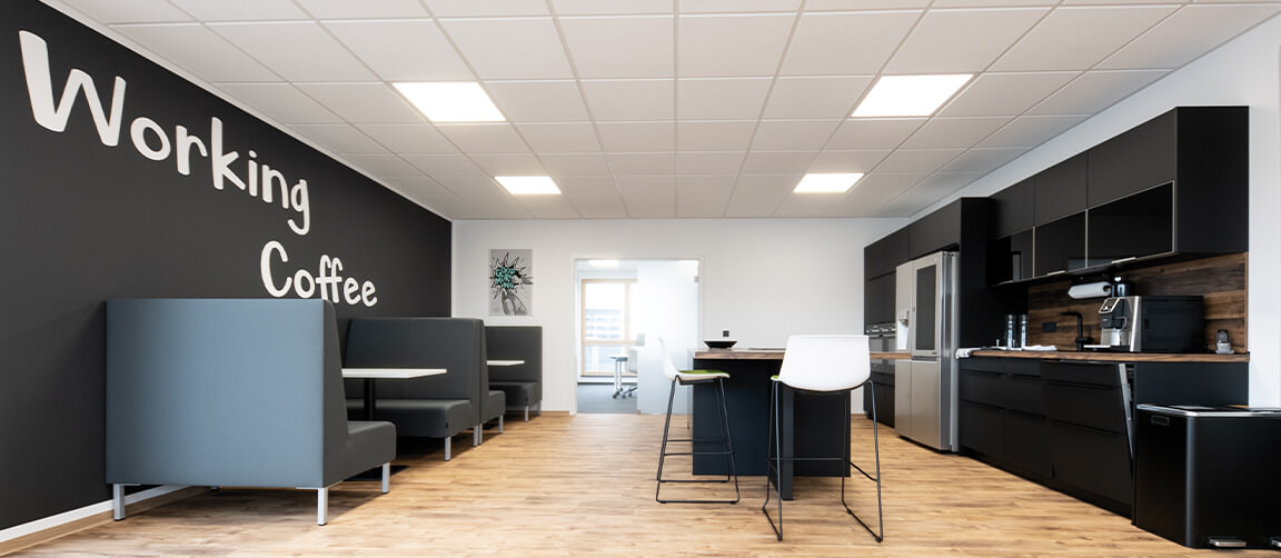 Denn mit dem Umzug in eigene Räume wollte der Unternehmer zusätzliche Erfolgsfaktoren für die Zukunft erschließen. Das offen und locker gestaltete Raumprogramm schafft ideale Umfeldbedingungen für produktives Wirken qualifizierter Mitarbeiter. Ob Großraumbüro mit transparenten Raumteilern, Technik-Werkstatt, Lager oder Working Coffee, für jede Anforderung entstanden die genau passenden Workspaces.