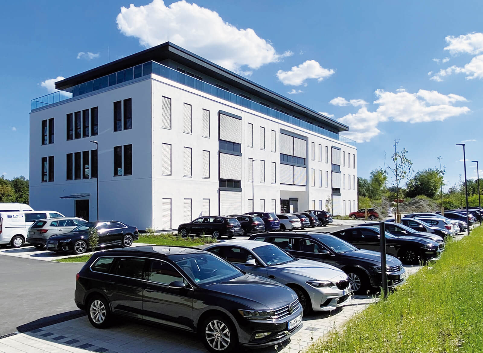Architektonisch überzeugt die neue Zentrale des IT-Unternehmens, das sich unter anderem mit der digitalen Präsentation von mittelständischen Firmen beschäftigt, mit viel Glas, bodentiefen Fenstern und großzügigen Pfosten-Riegel-Fassaden aus Holz. Das Flachdach wird mit Aufdachdämmung optisch elegant abgeschlossen und bietet Platz für ein eigenes Solarstromkraftwerk zur Eigenversorgung.