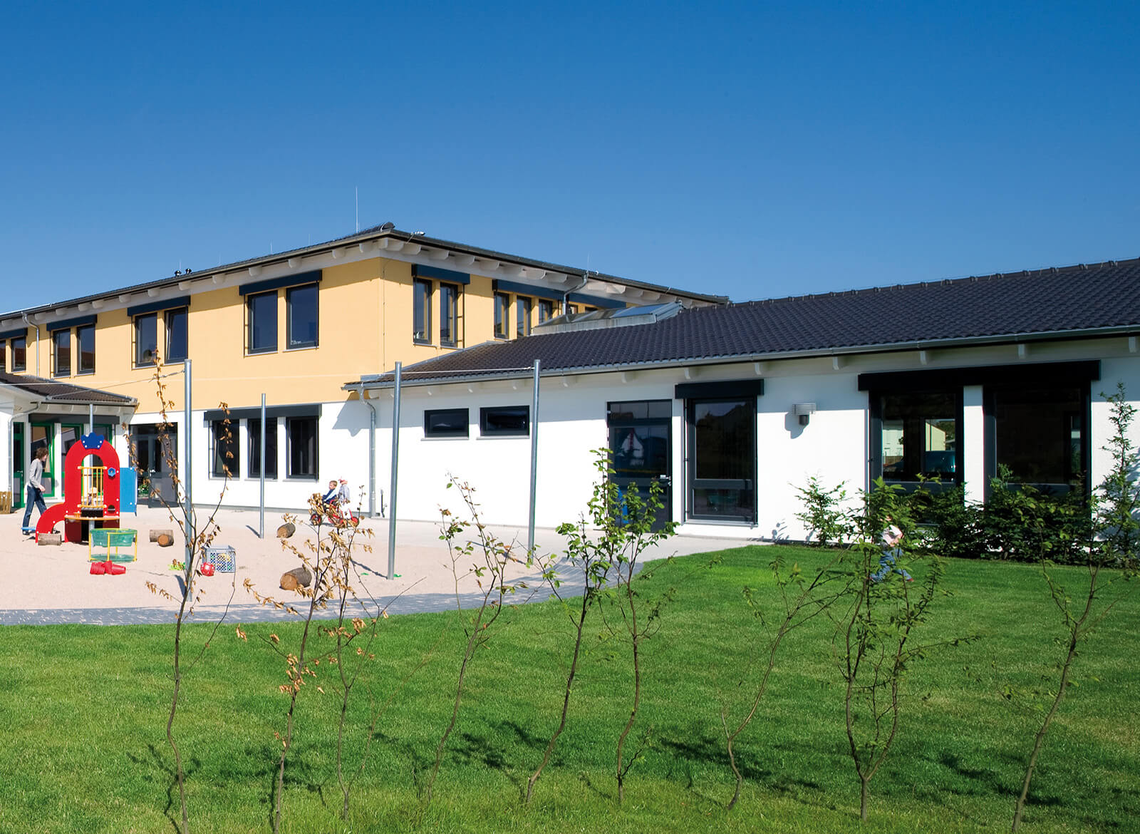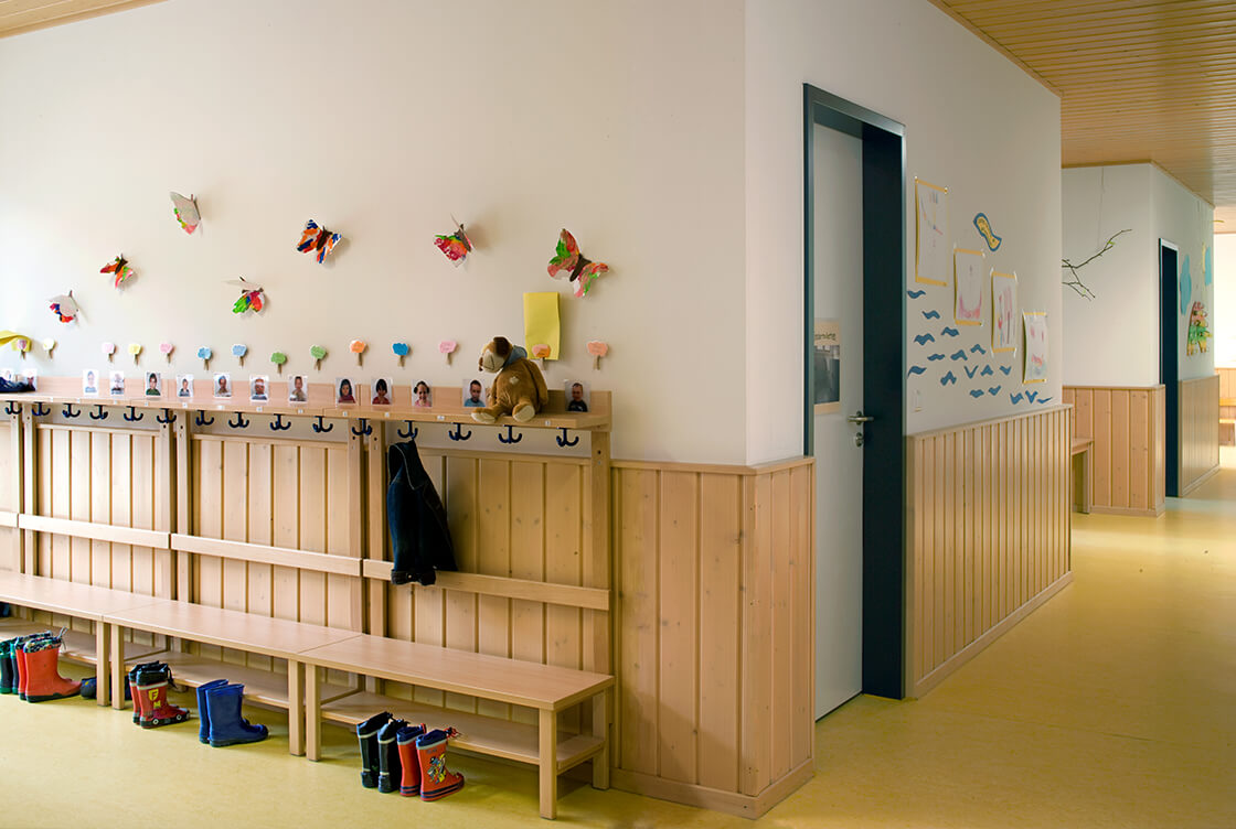 So sind ein integrativer Kindergarten, eine Kinderkrippe sowie große kombinierbare Mehrzweckräume für örtliche Anbieter von Freizeitarbeit wie Vereine, Kirchen, Kommunen und Initiativen entstanden. Alles behindertengerecht, inklusive Aufzug. Für eine kinderfreundliche helle und warme Atmosphäre sorgen großzügige Verglasungen in den Fassaden sowie eine Lichtkuppel im Zentralbereich. Viel sichtbares Holz und eine Spielgalerie sind weitere Beispiele der gelungenen Innenarchitektur. Geschäftsräume der Lebenshilfe ergänzen das Raumprogramm.